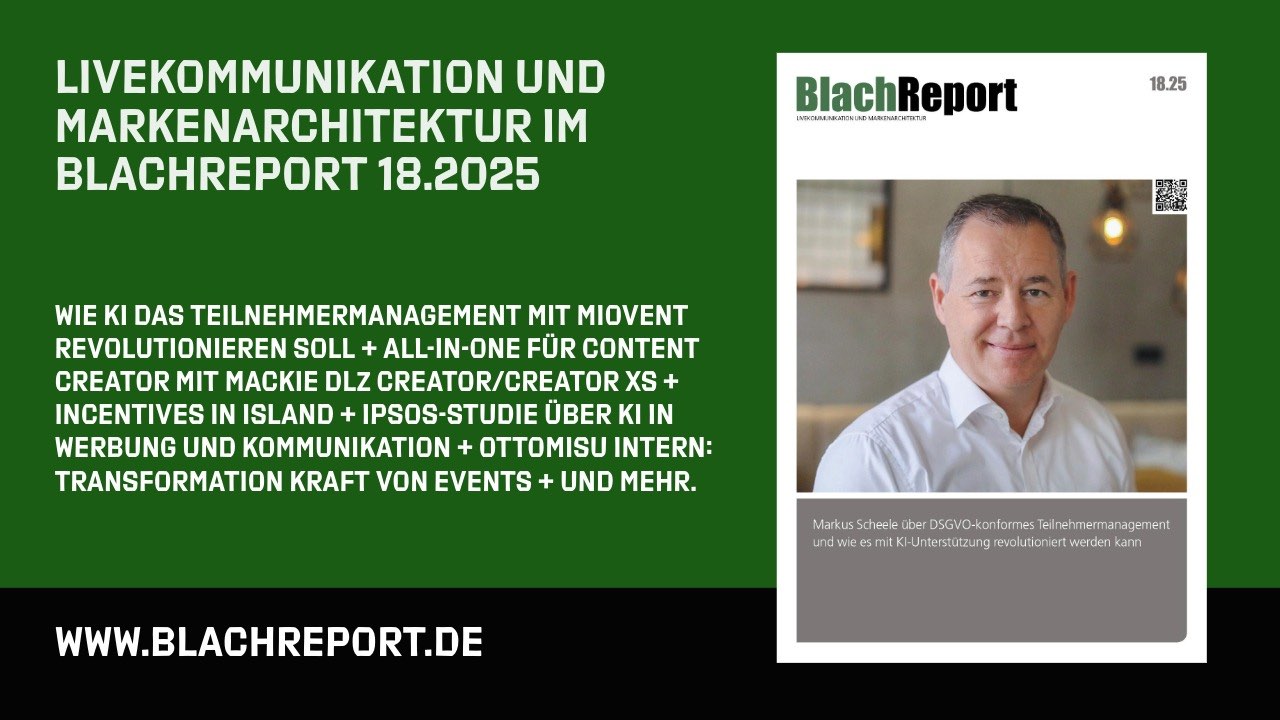 Bitte lesen in BlachReport 18.2025: Wie KI das Teilnehmermanagement mit miovent revolutionieren soll + All-in-One für Content Creator mit Mackie DLZ Creator/Creator XS + Ipsos-Studie über KI in Werbung und Kommunikation + Incentives in Island + ottomisu intern: Transformation Kraft von Events + und vieles mehr.