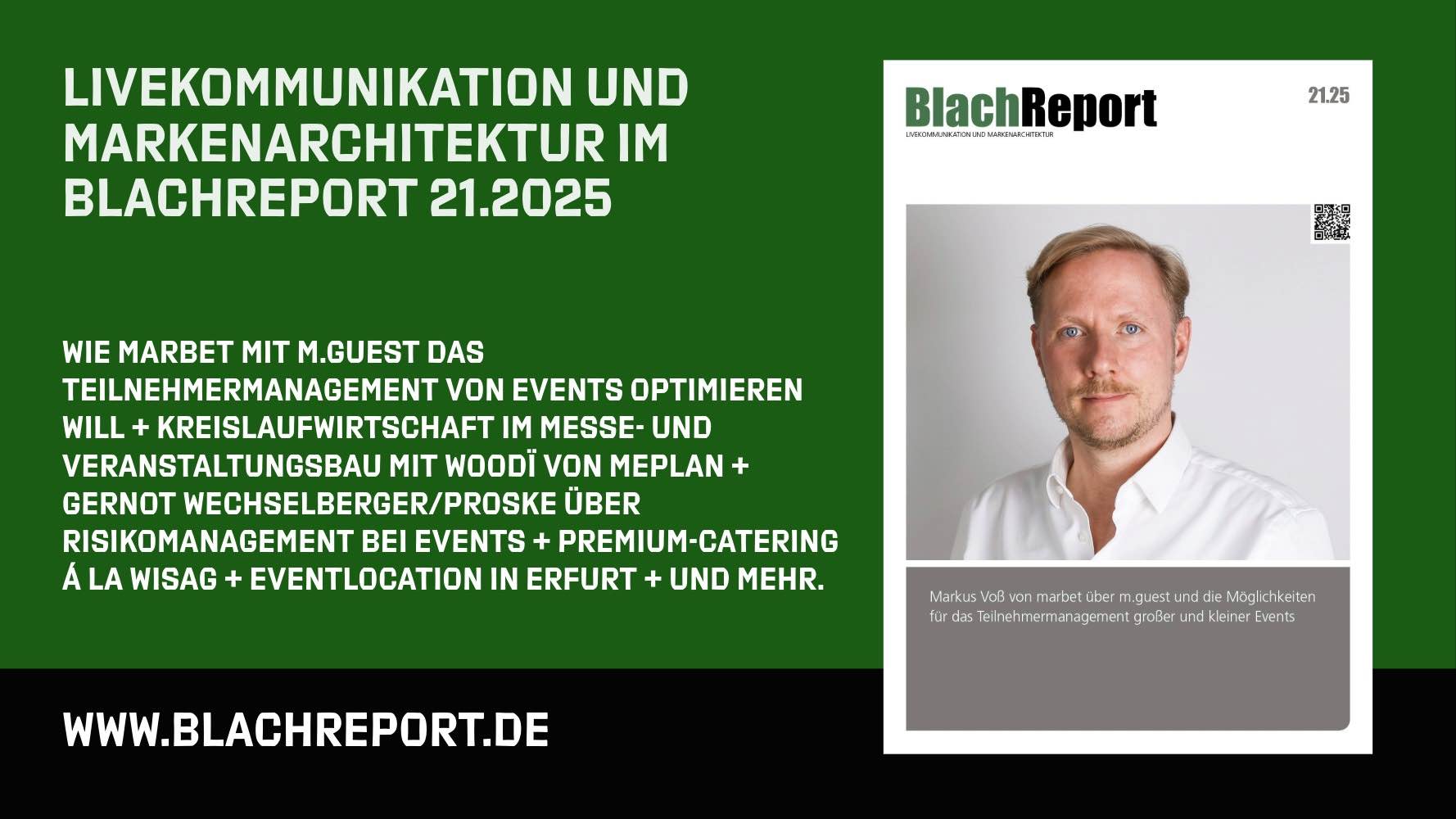 Bitte lesen in BlachReport 21.2025: Wie marbet mit m.guest das Teilnehmermanagement von Events optimieren will + Kreislaufwirtschaft im Messe- und Veranstaltungsbau mit woodï von meplan + Invitario-Studie 2025 + Gernot Wechselberger/Proske über Risikomanagement bei Events + Premium-Catering á la Wisag + Eventmanagement-Studiengang bei D.College in Düsseldorf + Eventlocation in Erfurt + und mehr.
