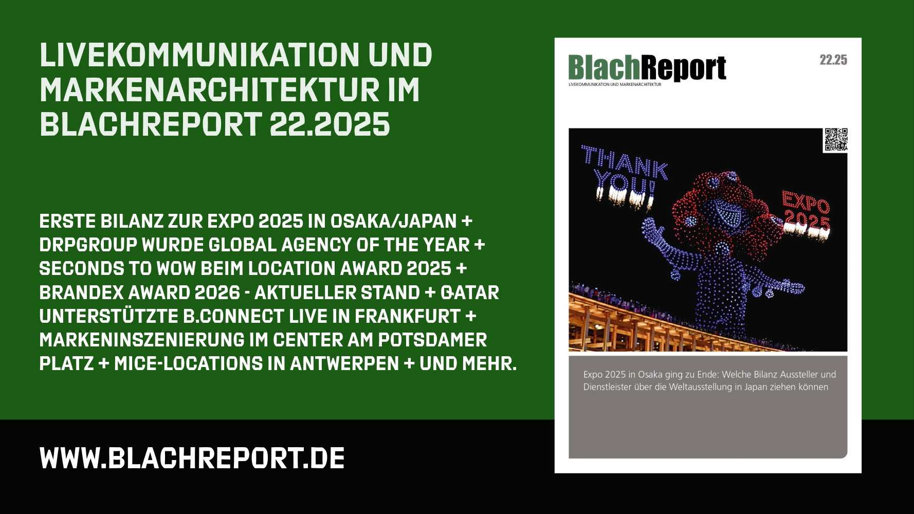 Bitte lesen in BlachReport 22.2025: Erste Bilanz zur Expo 2025 in Osaka/Japan + DRPGroup wurde Global Agency of the Year + Seconds to WOW beim Location Award 2025 + BrandEx Award 2026 – aktueller Stand + Visit Qatar unterstützte b.connect live in Frankfurt + Markeninszenierung im Center am Potsdamer Platz Berlin + MICE-Locations in Antwerpen + und mehr.