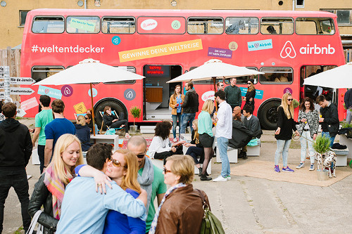 Die Kreation, Planung und Umsetzung für die aktuelle Roadshow von AirBnB stammt von heretonow aus Berlin. Seit Ende April und noch bis zum 13. Juni läuft die Tour mit Stopps in mittelgroßen Städten Deutschlands. Besucher des Doppeldeckerbusses können das Angebot von AirBnB, Online-Marktplatz für die Vermittlung von Unterkünften, kennenlernen, sich eine eigene Weltreise zusammenstellen und diese am Ende der Roadshow auch gewinnen. Bei den jeweiligen Terminen vor Ort sorgt die AirBnB Community für Zerstreuung, beispielsweise mit einem Barista Kurs oder einem Poetry Slam.