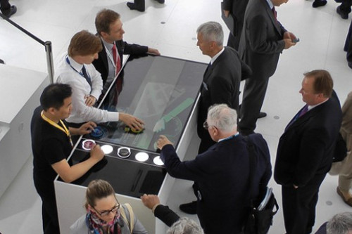 Bis zu vier Personen gleichzeitig können auf der Oberfläche des Tisches mit den oben beschriebenen Tangibles die digitalen Informationen der Applikation steuern und beeinflussen. Das geschieht durch das Drehen, Schieben oder Verbinden von mehreren Tangibles und der erweiterten Multi-Touch Bedienung auf dem Screen. Die Anzahl der parallelen Touch-Interaktionen ist unbegrenzt.