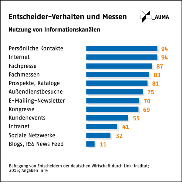 Welche Infokanäle nutzen Entscheider, welche Instrumente nutzen sie, um Investitionen vorzubereiten und welche Rolle spielen dabei Messen? Diese Fragen stellte das Link-Institut, Frankfurt, 1.000 Entscheidern der deutschen Wirtschaft in der ersten Jahreshälfte 2015. Die Studie im Auftrag des AUMA liegt jetzt unter dem Titel „Informations- und Beschaffungsverhalten von Entscheidern“ vor.