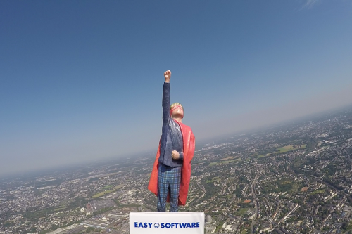 Sein rotes Cape liegt eng am Körper an, der Blick geht gen Firmament und seine Hand ist entschlossen zur Faust geballt. Rasant lässt der „Superheld“ den Erdboden hinter sich und steigt in atemberaubendem Tempo zum Himmel empor. Dies war die Eröffnung zur Easy World 2016. Als Highlight des diesjährigen internationalen Kongresses des Software-Anbieters Easy Software ließ East End einen 15 Zentimeter großen Mini-Superhelden in 35 Kilometer Höhe zu einem Stratosphärenflug aufsteigen. Das daraus produzierte Video transportiert das Motto der Veranstaltung: „Hinterm Horizont geht’s weiter – Digitalisierung kennt mit Easy keine Grenzen“ und kommt über den gesamten Veranstaltungszeitraum zum Einsatz.