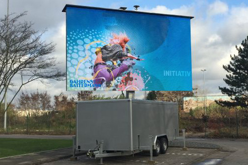 Gahrens + Battermann (G+B) hat Trailer mit LED-Modulen neu bestückt. Die beiden Fahrzeuge wurden mit 5,2 mm-Absen X5 Modulen ausgestattet. Die Idee bei der Entwicklung: Die Umsetzung zweier gleichgroßer Wände mit größtmöglicher Bildfläche. Gemessen an der Traglast und unter Berücksichtigung der Windlast des Trailers, wurde mit rund 20 qm das Maximum an Videodisplayfläche verbaut. Somit können zwei Screens mit identischer Displaygröße zum Einsatz kommen.