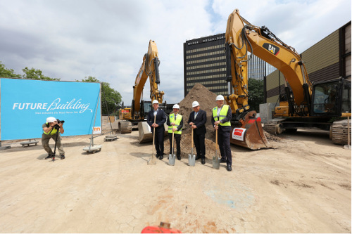Am 14. Juli gaben der Düsseldorfer Oberbürgermeister Thomas Geisel, Vorsitzender des Aufsichtsrats der Messe Düsseldorf, Helmut Oberholz, Geschäftsführender Gesellschafter des beauftragten Architekturbüros slapa oberholz pszczulny sop architekten, Thomas Kleine-Kalmer, Prokurist und Bereichsleitung Großprojekte des Generalunternehmers Köster GmbH und Werner M. Dornscheidt, Vorsitzender der Geschäftsführung der Messe Düsseldorf GmbH, mit dem Spatenstich den Startschuss für eines der ambitioniertesten Bauprojekte in der Geschichte der Messe Düsseldorf.