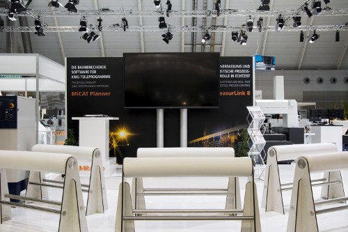 Für den Vortragsbereich auf dem Messestand kam ein Technik-Paket aus professionellem Licht-, Audio- und Videoequipment zum Einsatz. Über ein 4K-84“-Display von NEC konnten die Besucher alle Informationen rund um die Welt der ultramodernen Längenmesstechnik in gestochen scharfer Qualität miterleben.