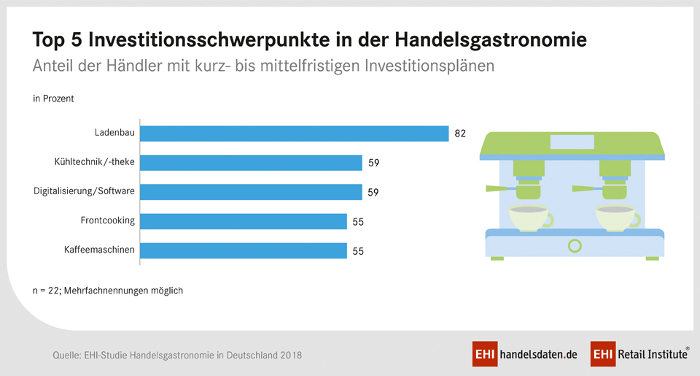 Ein modernes Ambiente mit Wohlfühl-Atmosphäre möchten Handelsunternehmen ihren Kunden bieten und dabei einen möglichst individuellen Gesamteindruck hinterlassen. Dafür planen 82 Prozent der Befragten kurz- bis mittelfristig in Ladenbau-Maßnahmen zu investieren. Hier ist auch die Ausstattung relevant, die im direkten (Sicht-)Kontakt zum Kunden steht wie beispielsweise die Kühltechnik und -theken (59 Prozent) oder Frontcooking-Einheiten (55 Prozent). Andere Schwerpunkte sind Digitalisierung und Software wie Warenwirtschaftssysteme (59 Prozent). Dass sich der Aufwand lohnt, steht für 74 Prozent der Interviewten außer Frage – sie messen der Handelsgastronomie eine hohe bzw. sehr hohe Bedeutung bei.