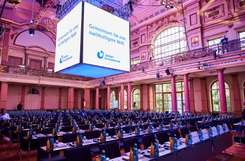 Nicht nur bei der inhaltlichen Konzeption stand das Thema Nachhaltigkeit im Mittelpunkt, auch in der Umsetzung war für Union Investment das Einhalten der Kriterien eines nachhaltigen Veranstaltungsmanagements elementar. Deshalb wählten die Verantwortlichen mit dem Frankfurter Palmengarten eine zentral gelegene und mit öffentlichen Verkehrsmitteln gut erreichbare Location. Beim Catering wurde die Auswahl auf regionale und saisonale Speisen gelegt.