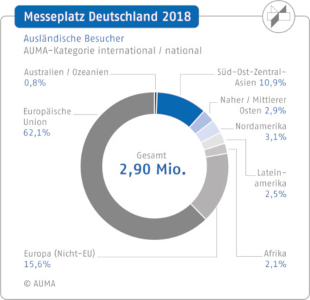 Rund 30 Prozent der Besucher internationaler und nationaler Messen kamen 2018 aus dem Ausland. Damit wurde das Spitzenergebnis des Vorjahres erneut erreicht. Rund 640.000 der insgesamt 2,9 Millionen ausländischen Besucher (=22%) kamen aus Ländern außerhalb Europas. Dies unterstreicht sehr klar die Rolle des Messeplatzes Deutschland als weltweit führender Standort internationaler Leitmessen, wie Berechnungen des Auma zeigen. Im Vergleich zu den Vorveranstaltungen der 2018er Messen stieg die Zahl ausländischer Besucher um durchschnittlich gut drei Prozent. Einbußen aufgrund sich ausweitender Handelskonflikte waren bisher nicht zu beobachten.
