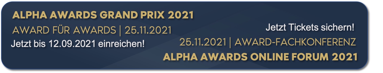 Der alpha awards Grand Prix prämiert herausragende Awards und Wettbewerbe im DACH-Raum, denen es gelungen ist, strategische Ziele zu erreichen und Menschen in Bewegung zu bringen. Die Einreichungen für diesen „Award der Awards“ sind ab 12. September 2021 möglich, die Votingphase reicht vom 4. bis 17. Oktober 2021. Zehn Tage später, am 27. Oktober 2021, werden schließlich die Nominees bekanntgegeben. alpha awards ist ein Produkt der 79 Blue Elephants GmbH, einem der führenden Anbieter von Award Consulting und Award Management Software im DACH-Raum.