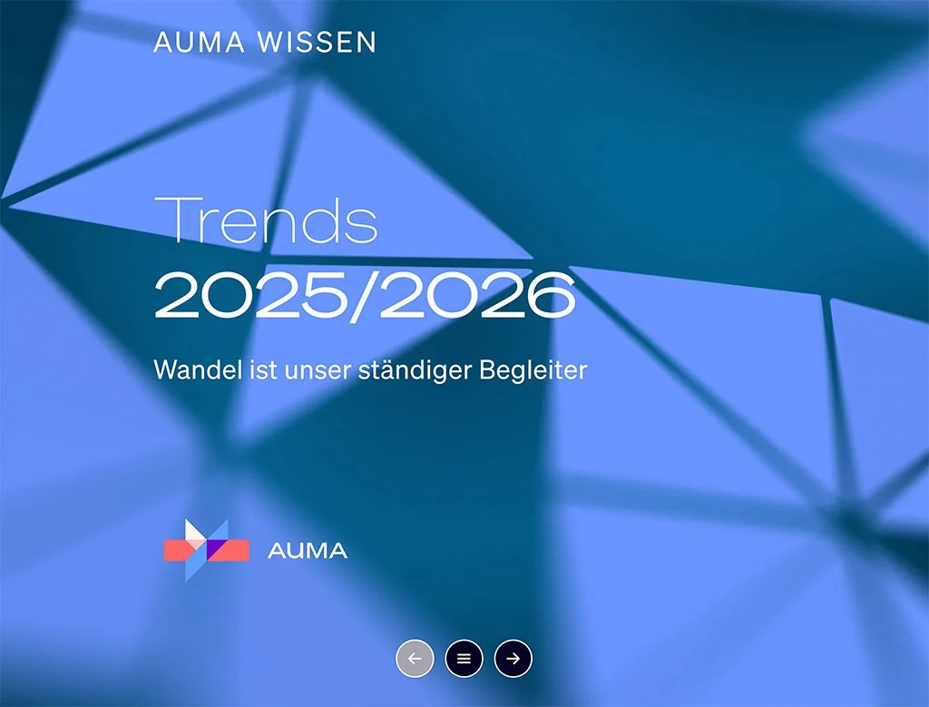 Mit Zahlen und Fakten belegt der AUMA die Entwicklung der deutschen Messewirtschaft. Gegeben wird ein Update zur nachhaltigen Transformation der Branche mit Blick auf die Praxistauglichkeit von EU-Richtlinien. Vom neuen Selbstverständnis einer Branche erzählt die Social-Media-Aktion MesseMonatMärz. Zur Publikation „Trends 2025/2026“ geht es hier.