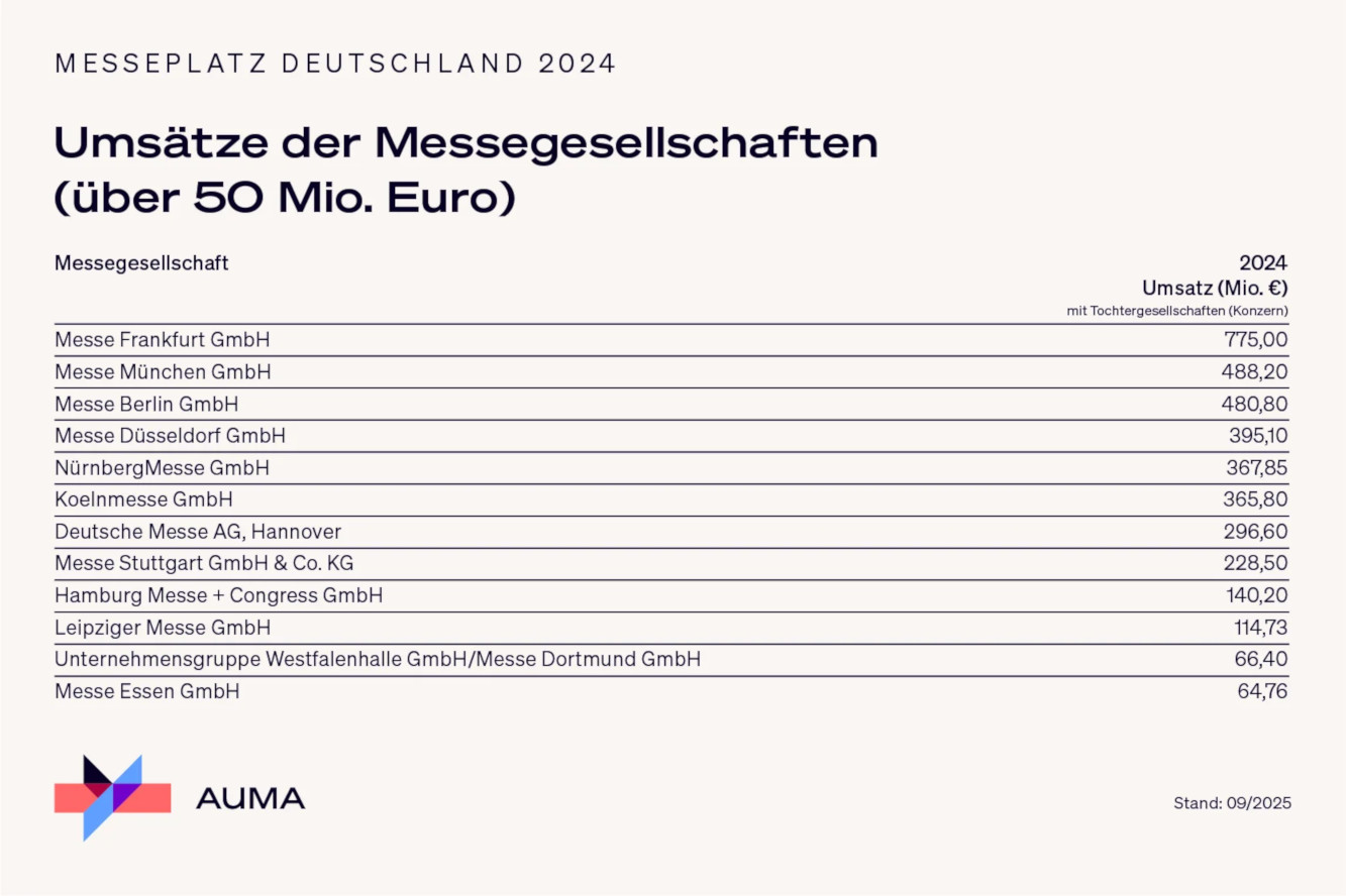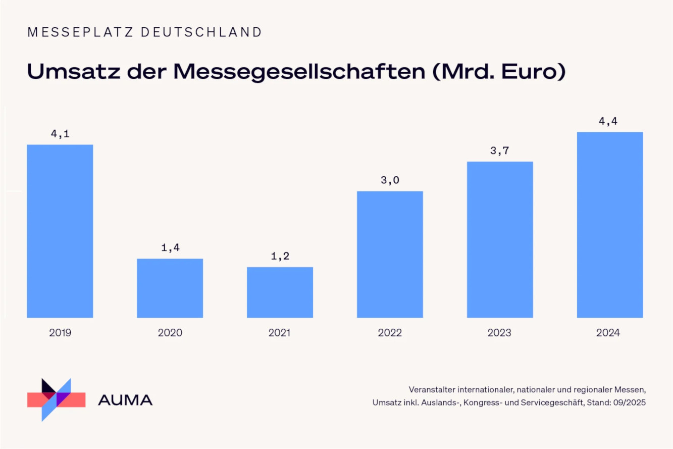Von den mehr als 300 geplanten Messen in Deutschland im Jahr 2025 haben laut AUMA in den ersten neun Monaten knapp 230 stattgefunden, 76 sind für das vierte Quartal vorgesehen. Angesichts der aktuellen wirtschaftlichen Herausforderungen, geopolitischer Krisen sowie turnusbedingter Effekte erwartet der Verband für 2025 einen Umsatz, der leicht unter dem Vorjahresniveau liegen wird. 2024 erzielten die AUMA-Mitgliedsgesellschaften mit 4,4 Milliarden Euro Umsatz ein Rekordergebnis. Damit setzte sich das Wachstum der Branche fort.