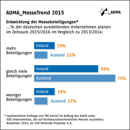 Ein Drittel der ausstellenden Unternehmen in Deutschland will in den nächsten zwei Jahren mehr Geld in Messebeteiligungen investieren als 2013/2014, nur 14 Prozent weniger. Gut die Hälfte plant konstante Ausgaben. Dies ergab eine Befragung von 500 repräsentativ ausgewählten Firmen durch TNS Infratest im November 2014 im Auftrag des AUMA. „Die Aussteller gehen offensichtlich mit Optimismus in ihre nächsten Messebeteiligungen“, betonte der AUMA-Vorsitzende Walter Mennekes, im Herbst-Pressegespräch des Verbandes am 2. Dezember 2014 in Köln.