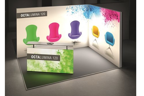 Octalumina 120 ist die neueste Produktserie von Octanorm. Dabei handelt es sich um ein flexibles Leuchtwandsystem mit eingebauter LED-Technik. Die integrierte Lichttechnik besteht aus steckerfertig vormontierten LEDs. Die Montage der kompletten Leuchtwände inklusive LED-Lichttechnik, Netzteil und Rahmen-Aussteifung gestaltet sich dank intelligenter Bauweise unproblematisch. Die Beleuchtungstechnik ist unsichtbar im oberen und unteren Rahmenprofil des Elements fest eingebaut und gewährleistet eine gleichmäßige Helligkeit. Durch Einsatz neuartiger Optik mit Linsenstreuung von innen heraus, wird Ausleuchtung und Farbwiedergabe des Printmotivs optimiert. Die Grafik kann ein- oder beidseitig hinterleuchtet werden.