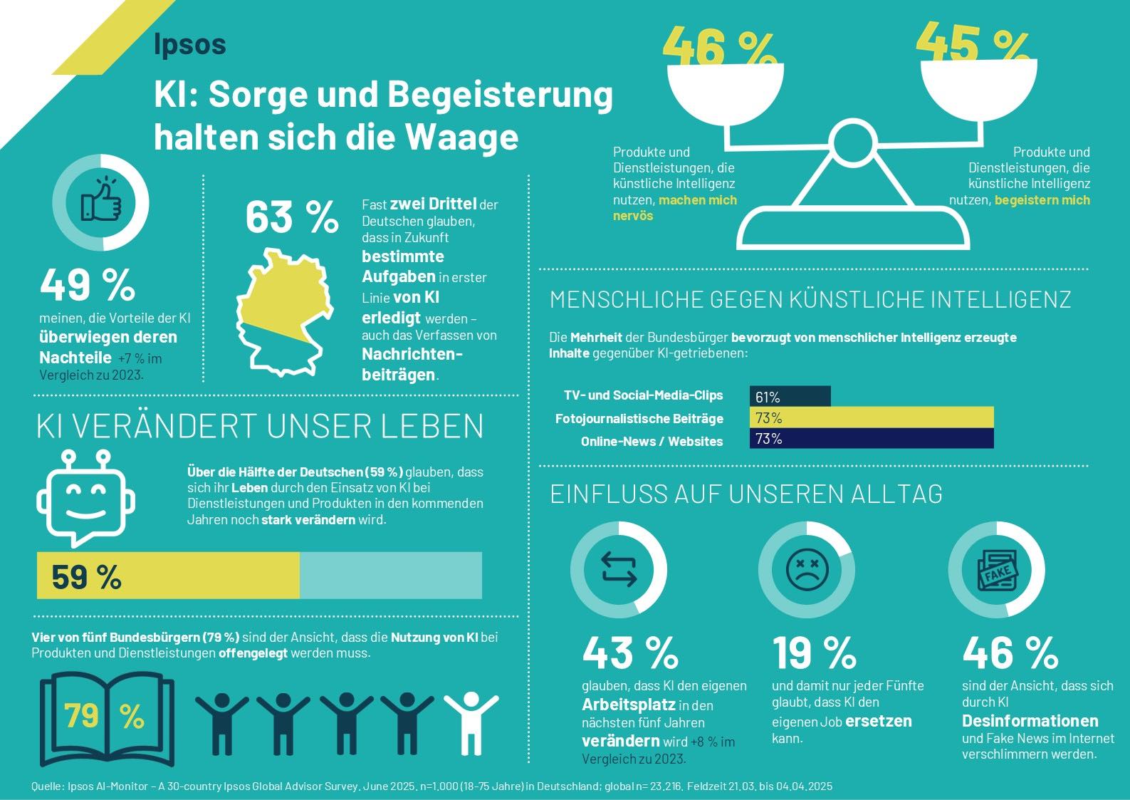 Dr. Christoph Preuß, CEO von Ipsos Deutschland, ordnet die Ergebnisse so ein: „Wir sehen einen positiven Einstellungstrend. Trotz bestehender Vorbehalte erkennt eine Mehrheit das Potenzial der KI, besonders in der werblichen Kommunikation. Mit wachsender Leistungsfähigkeit wird auch der Druck steigen, KI produktiv zu nutzen.“