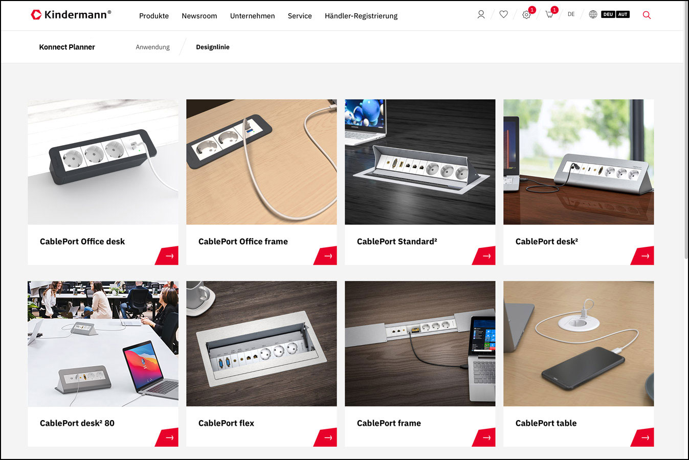 Bekannt ist Kindermann für sein Angebot an Tischanschlussfeldern, die am Standort in Eibelstadt bei Würzburg gefertigt werden. Die Bandbreite der CablePorts bedient alle Ansprüche an Design und Anschlussvielfalt. Der modulare Aufbau sowie das Konnect flex 45 Klick-System sorgen für weite Anpassungsmöglichkeiten. Modelle für die Anbringung an, auf oder in Tischen stehen ebenso zur Verfügung wie Varianten in verschiedenen Größen und Ausführungen mit und ohne Abdeckung.