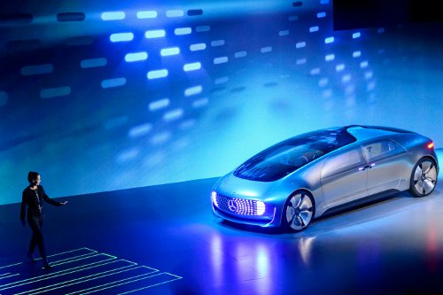Der autonom fahrende Mercedes-Prototyp F 015 nutzt ein integriertes Laser-Display zur Kommunikation mit Fußgängern und anderen Fahrzeugen. Am 5. Januar präsentierte Daimler-Chef Dieter Zetsche in seiner Keynote zur Unterhaltungs-Elektronikmesse CES dem erstaunten Publikum die Zukunftsvision von Mercedes zum autonomen Fahren in Form des spektakulären Prototypen „F 015 – Luxury in Motion“.