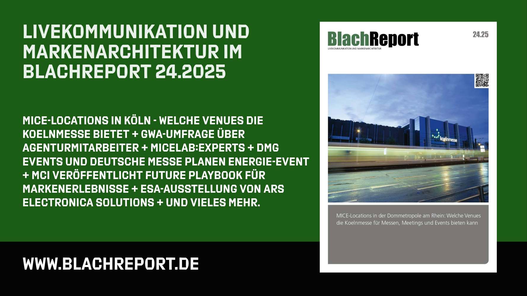 Bitte lesen in BlachReport 24.2025: MICE-Locations in Köln – welche Venues die Koelnmesse bieten kann + GWA-Umfrage über Agenturmitarbeiter + micelab:experts + dmg events und Deutsche Messe planen neuen Energie-Event + MCI veröffentlicht Future Playbook für Markenerlebnisse + ESA-Ausstellung von Ars Electronica Solutions + und vieles mehr.