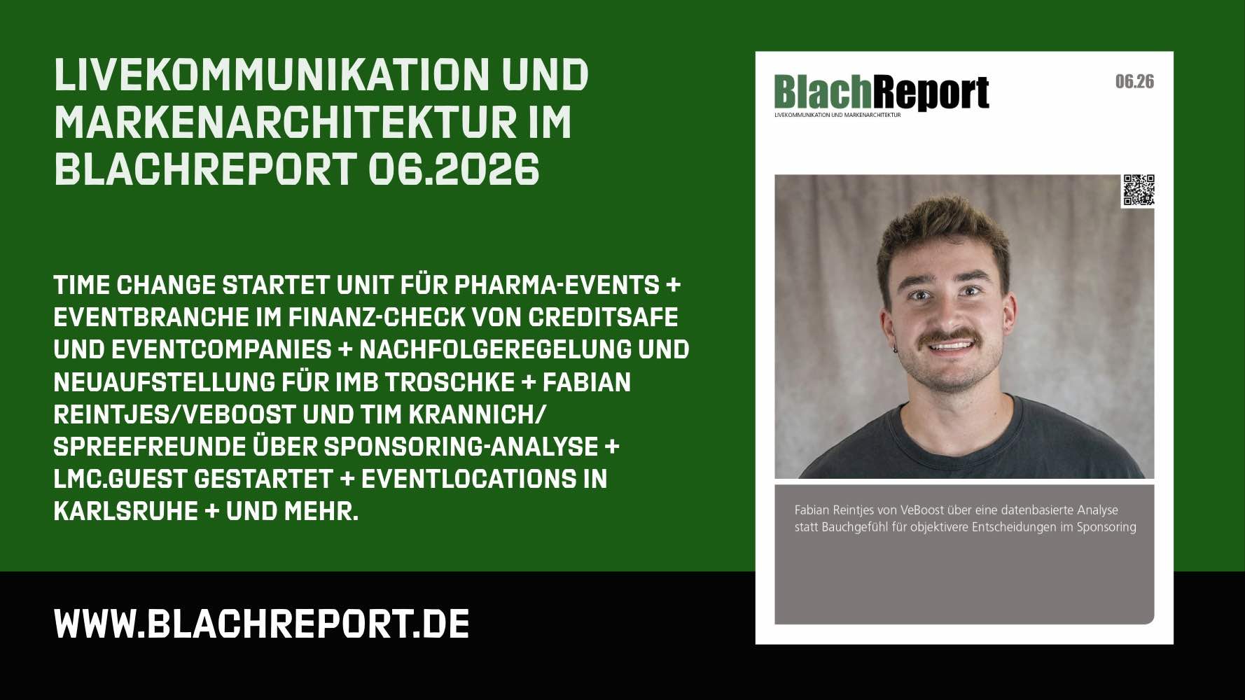 Bitte lesen in BlachReport 06.2026: time change startet Unit für Pharma-Events + Eventbranche im Finanz-Check von Creditsafe und eventcompanies + Nachfolgeregelung und Neuaufstellung für imb troschke + Fabian Reintjes/VeBoost und Tim Krannich/Spreefreunde über Sponsoring-Analyse + LMC.Guest gestartet + Eventlocations in Karlsruhe + und vieles mehr.