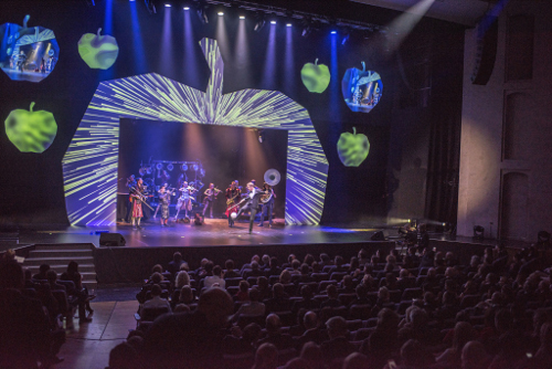Das von der Agentur White Label Events aus Wuppertal entworfene Bühnen Set-up sah dabei verschiedene technische Herausforderungen vor: So wurden etwa gleichzeitig acht Projektionsflächen, zum Teil in Apfelform, zum Teil als motorisch verfahrbare Leinwand bespielt.