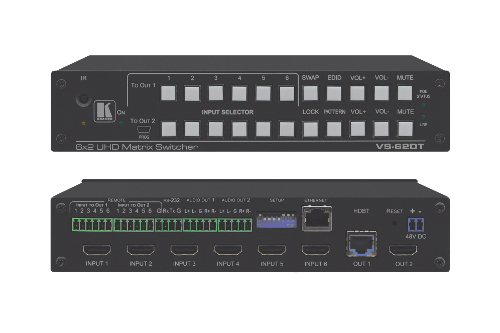 Der neue VS-62DT Matrix-Schalter von Kramer ist eine kostengünstige Lösung zur flexiblen Bildwiedergabe auf zwei unabhängigen Senken. Er verfügt über unabhängig schaltbare HDMI und HDBaseT Ausgängen. Sechs HDMI Eingänge können mit Auflösungen bis zu 4K60 4:2:0 frei auf beide Ausgänge geschaltet werden. Zusätzlich verfügt der VS-62DT über automatische Umschaltung, Audio De-Embedding und Power over Ethernet (PoE) zur Fernspeisung kompatibler HDBaseT Empfänger.