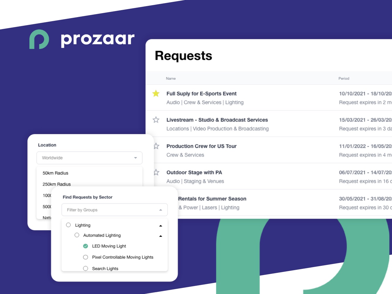 Im Gegensatz zu anderen bereits bestehenden Marktplätzen ist Prozaar speziell für die Besonderheiten von Live-Veranstaltungen und Broadcast-Produktionen ausgelegt und verspricht, den kompletten Workflow zu bedienen – von der Anfrage bis zum Angebot und zur Bestellung. Dies soll Unternehmen ermöglichen, den kompletten Kreislauf auf nur einer Plattform zu organisieren.