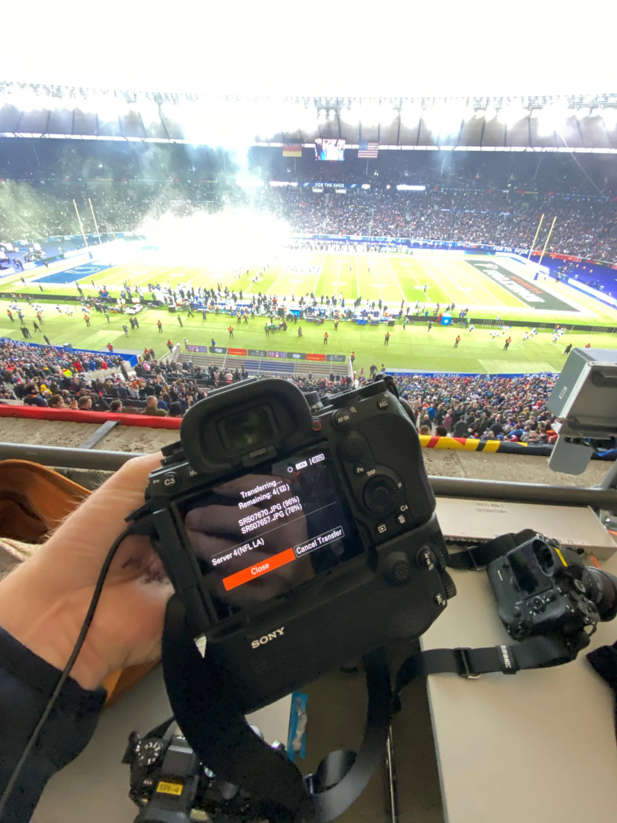 In Live-Situationen wie dem NFL-Spiel ermöglicht der PDT-FP1 die Übertragung direkt von einer Kamera zu einem Cloud- oder Serverziel. Bei den Foto-Teams, die die Atmosphäre in den Fan-Zones und im Stadion für die NFL eingefangen haben, kam der mobile Datentransmitter zum Einsatz. Er wurde speziell für professionelle Foto- und Videoproduktionen entwickelt und verfügt über Dual-SIM-Funktionalität, einen großen Touchscreen, aktive Kühlung und vielseitige Anschlussmöglichkeiten. Dabei soll er automatisch das stärkere Netzwerk basierend auf den Signalbedingungen auswählen und gegebenenfalls die SIM-Karten für die Datenübertragung wechseln. Das Antennendesign ist laut Sony für maximale Empfangsempfindlichkeit optimiert und soll eine schnelle Kommunikation mit geringer Latenz über 5G-Netze ermöglichen.