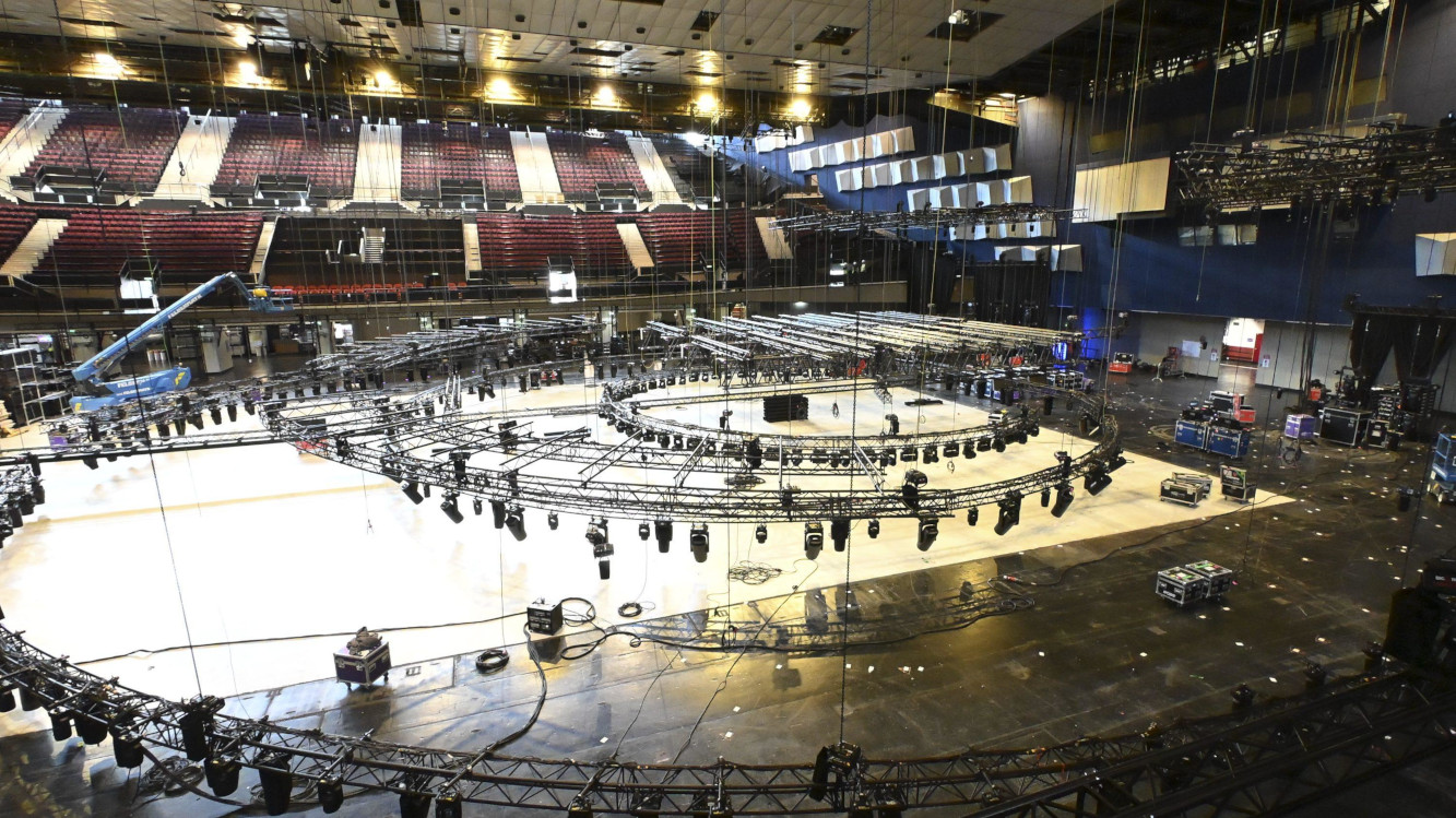 Bereits seit Ende März wird zehn Stunden täglich am Aufbau gearbeitet, seit Kurzem sogar in einer Tag- und Nachtschicht, also täglich zwanzig Stunden. 75 Prozent des Gerüsts in Halle D sind bereits vorbereitet, etwa 50 Prozent der Scheinwerfer wurden montiert. Rund 300 Personen sind zu Spitzenzeiten in der Stadthalle im Einsatz.