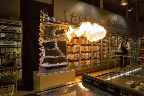 Im Auftrag von Edeka Zurheide Düsseldorf war dafür in einem Nachtaufbau ein 13 Meter breiter Nebelvorhang über den Kühlschränken im Tiefkühlbereich des Marktes installiert worden. Als Schleier floss der Nebel dann aus einer Höhe von sechs Metern über die Schränke nach unten. Darüber hinaus wurde ein Feuereffekt in einem Drachenkopf aus Eis installiert, zu dem sich noch drei weitere Flammeneffekte gesellten, die in Eissäulen brannten. Hinter der Käsetheke sorgte ein simuliertes Feuer für Atmosphäre, während am Eis- und am Fischtresen Nebeleffekte die Szenerie beherrschten.