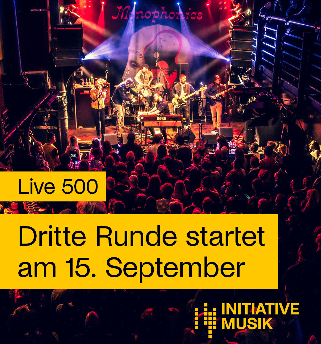 Das Förderprogramm Live 500 der Initiative Musik startet am 15. September mit einem Budget von knapp einer Million Euro in die dritte Runde. Kleine bis mittlere Musikspielstätten sowie regionale Veranstalter können Zuschüsse für bis zu 20 Veranstaltungen mit bis zu 250 Gästen bei Konzerten oder 500 Gästen bei überwiegenden DJs im Line-Up Zuschüsse von jeweils 500 Euro beantragen.