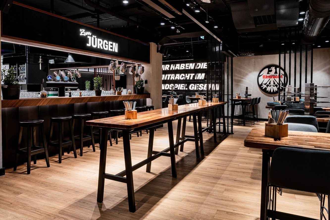 Im Frankfurter Deutsche Bank Park sind mehrere Angebote im Hospitality-Bereich entstanden, die sich im Charakter klar unterscheiden. Im nördlichen Mittelrang der Jürgen-Grabowski-Tribüne ist „Zum Jürgen“ im Stil einer Sportsbar mit 311 Sitzplätzen gestaltet. Stehtische, Barhocker und ein sportlich inspiriertes Interieur schaffen ein Umfeld, in dem sich Besucher rund um das Spiel austauschen können. Das Speisen- und Getränkeangebot ist nah an klassischen Bar-Snacks, wird aber von Supreme auf VIP-Niveau umgesetzt.