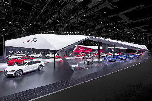Die architektonisch anspruchsvolle Markeninszenierung bestach durch ihre markante Form, die von allen Seiten einen ausgezeichneten Blick auf die Standfläche zuließ. Der aufwendig illuminierte und als Eingangsportal konzipierte „Pace Frame“ bildete den Kommunikationsraum für die sportlichsten Modelle des Automobilherstellers. Auf dem Stand überzeugten hochwertige Materialien und der wohlgewählte Einsatz von Glas. Ein Highlight-Podest mit großflächiger LED-Rückwand für digitale Inhalte bildete den Mittelpunkt der Präsentation. Hier stellte der Premiumhersteller seine Weltpremieren Audi Q7 e-tron TFSI und Audi prologue allroad der Öffentlichkeit vor. In einem gesonderten Lounge-Bereich im Obergeschoss eröffneten sich Möglichkeiten zum Austausch in entspannter Atmosphäre. Abgeschirmt vom Besucherstrom bot eine exklusive Fahrzeuglounge die Gelegenheit für Gespräche.