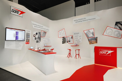 Die kantigen Formen des Messestandes griffen das Logo von Gore auf und gewährten dem vorbeigehenden Fachbesuchern immer wieder wechselnde Einblicke in die Makrowelt des ePTFE.