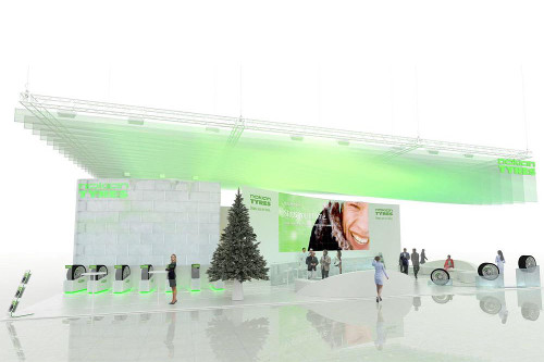 Nokian Tyres präsentiert seine Produkte als Erlebnis im Stil der finnischen Landschaft mit viel Schnee und Eis. Eine 30 Quadratmeter große LED-Wand strahlt das Polarlicht aus, das von speziellen, sich bewegenden Deckenplatten reflektiert wird. Die Eis-Bar lädt zu Gesprächen mit den Nokian Tyres Mitarbeitern ein.