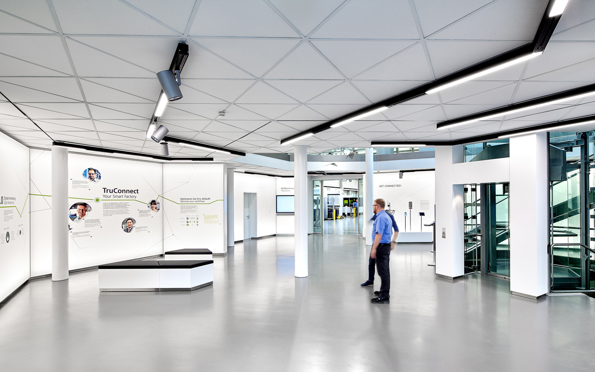 Am Trumpf Firmenhauptsitz in Ditzingen präsentiert sich der schwäbische Maschinenbauer mit einem neuen, von Atelier Brückner gestalteten, Auftritt. Das TruConnect Besucherforum bietet einen Überblick über aktuelle und zukünftige Möglichkeiten der vernetzten Fertigung. Material und Formensprache der Ausstellungsarchitektur sind der Produktion entlehnt. Einzelne metallene Elemente wurden vor Ort angefertigt, so beispielsweise der ornamental wirkende Windfang, Zugang zur Ausstellung.