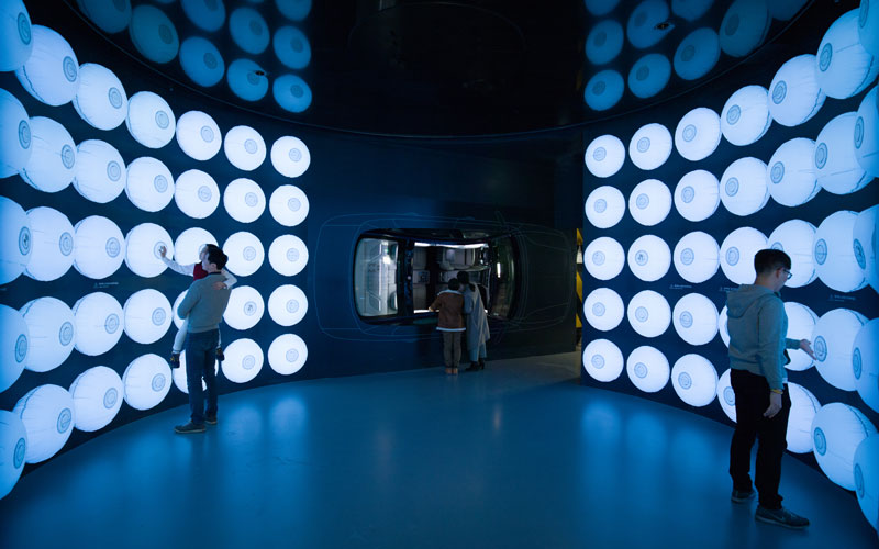 Den Höhepunkt der Ausstellung bildet eine kinetische Skulptur, die sich im Obergeschoss des Gebäudes befindet. Die Besucher erreichen sie über einen Aufzug, der sie auf das Erlebnis einstimmt. Die filmische Bespielung des Aufzugs öffnet sich zum Design-Bereich und zieht die Besucher gleichsam in den automobilen Schöpfungsprozess hinein. Das raumumgebende Monitorband und die Skulptur sind gemeinsam choreografiert.