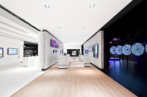 Die direkte Interaktion des Besuchers mit den Produkten stand im Mittelpunkt der Präsentation auf dem 425 Quadratmeter großen Stand, der den positiven Einfluss der NEC Display-Technologie auf Business-Abläufe erlebbar machte. Dabei war der Schauraum in drei Bereiche gegliedert. Im Zentrum fand sich ein großzügiges Kommunikationsareal mit Betonwänden, Holzboden und dem von Dart entworfenen Mobiliar, das die ausgestellten Screens eindrucksvoll in Szene setzte. Gerahmt wurde der Auftritt von einer weißen Fassade, in die unter der Brand Message „Orchestrating a brighter World“ riesige Videowände integriert waren.
