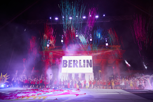 Dramaturgisch erzählten die Macher der Eröffnungsfeier zu Beginn eine emotionale Geschichte rund um den Turner und Protagonisten Philipp Boy. Neun Szenen erzählten von den Höhen und Tiefen eines Sportlerlebens. Das Publikum erlebte dabei spektakuläre Akteuere, Sport- und Performancekünstler wie beispielsweise die Kombo Flying Steps, Cosmic Artists oder die fliegenden Trommler von Sanostra, die direkt über dem Brandenburger Tor schwebten. Das Finale des Openings kulminierte in einer interaktiven Color-Mob-Farbexplosion aller Beteiligten Sportler, Musiker und Showgruppen.