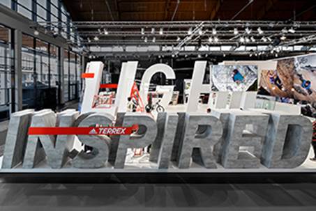 Dart entwickelt das Messedesign für adidas Terrex weiter: ein DJ Pult und eine Bühne, ergänzt durch einen großformatigen Screen, sind jeweils an der zentralen Wortskulptur „Light“ verortet. Programmpunkte wie die tägliche Happy Hour und Interviews mit Größen aus der Outdoor-Szene bieten der Community zusätzliche Aktionen vor passender Soundkulisse.