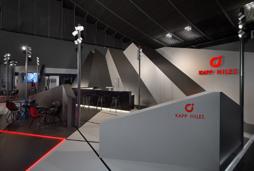 Die perspektivische Zeichnung eines Zahnrads und seine Fortführung als Ornament bildeten die Grundlage des Designs, welches in den dreidimensionalen Raum übertragen wurde. Damit entstand die perspektivische Präsentation eines überdimensionalen Zahnrades, die im hinteren Standbereich als bauliche Wandgestaltung umgesetzt wurde. Abwechselnd graue und anthrazitfarbene Wandflächen unterstreichen die Plastizität und die Ausrichtung der Zahnradflächen und verleihen dem Messestand eine lineare, technische Anmutung. Messerscharfe Linienführungen symbolisieren den Produktnutzen und die Qualität der Schleifmaschinen von Kapp Niles.