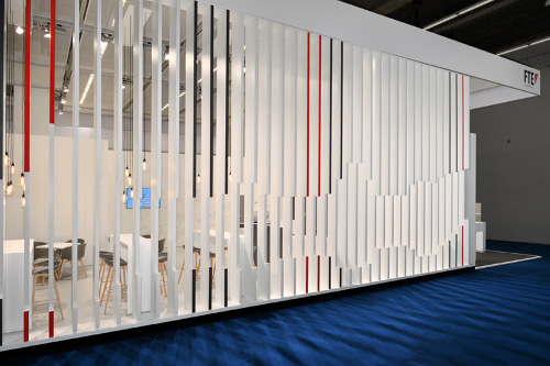 Dafür entwickelte KECK ein Konzept mit einzigartigen Lamellenwänden: Eine stringente Linienführung, zog sich entlang der Fassade durch. Die weißen Lamellen mit dezenten Marken-Farbakzenten sorgten für Fernwirkung und Wiedererkennung auf der Messe. Die Materialität wirkte einladend, jedoch auch raffiniert und technisch. Die Produktpräsenter zeichneten sich durch abstrakte Interpretation der FTE-Produkte ab – an der Front waren Konturen der FTE-Produkte ausgefräst.