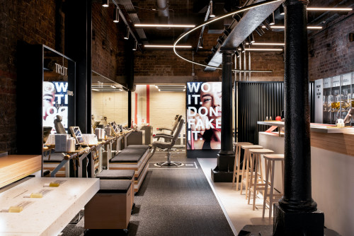 Sowohl die St. John’s Wood High Street als auch das dynamische Einkaufsviertel Coal Drops Yard zählen in London zu den angesagten Adressen im Premiumsegment. Bei der Realisierung beider Stores an diesen Standorten wurde ein besonderes Augenmerk auf die Einzigartigkeit der Marke gelegt: dem „Fitness-Training fürs Gesicht“, also der Faszien-Stimulation der über 40 Gesichtsmuskeln mit diversen Übungen und Massagen. Raumhohe Spiegel an den Wänden setzen in Verbindung mit montierten Turn-Barren entsprechende Akzente. Ein besonderer Eyecatcher, der sich wie ein roter Faden durch die Geschäfte zieht, ist ein Gummiband, das sich über Decken, Pulte und Schaufenster der Läden dehnt.