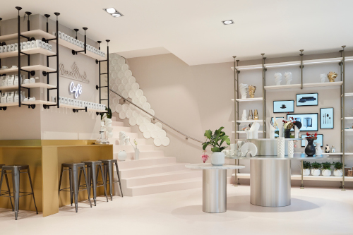 Der Kassenbereich wurde mit traditionell handgefertigtem Kammputz in Verbindung zur Porzellanrohmasse ausgestattet. Eine Lamellenwand aus heimischer Mooreiche gibt dem Raum Tiefe und lehnt sich an die Corporate Identity von Rosenthal an. Gold- und Edelstahlelemente spielen auf elegante Porzellandekore an. Im Erdgeschoss ergänzen ein Perlenvorhang aus Porzellan sowie eine Tellerwand das Interieur um skulpturale Elemente, die die Verbindung zwischen Kunst und Porzellan herstellen. In der ersten Etage befindet sich eine große Concept Kitchen für Tastings und Kochworkshops.