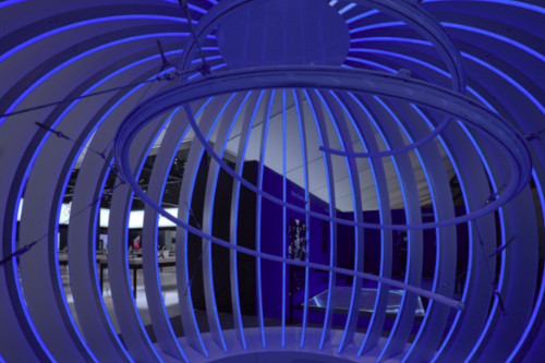 Um dem Auftritt einen monumentalen Raumcharakter zu verliehen, wurde ein schwebendes weißes Deckenelement eingeführt. Der maßstabsgetreue und nach innen gerichtete Charakter der abgehängten Decke sollte die Besucher dazu einladen, die Vielzahl an neuen Samsung-Produkten zu erleben. Die offene, leicht navigierbare räumliche Zonierung durch die dreidimensionale Gitterstruktur und die minimale Schwarz-Weiß-Farbpalette unterstützten das produktbezogene Messeerlebnis.