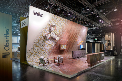 Auf einer Fläche von knapp 100m² hatte das mac-Team den fünf Meter hohen Gerflor Stand nach einem Konzept der Tulp Design GmbH angefertigt. Die Gerflor Mipolam GmbH bietet unter anderem individuell bedruckbare Bodenbeläge an. Im Digitaldruckverfahren lassen sich Objektbeläge für stark frequentierte Anwendungsbereiche komplett frei gestalten. Je nach Entwurfsidee mit individuellen Mustern und Farben, so zum Beispiel mit einem Unternehmens- Branding. „Und genau solche kreativen, individuell gefertigten Bodenbeläge verarbeiteten wir im Stand“, erklärt mac-Projektleiter Fabian Leidig.