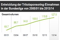 Die Einnahmen der Fußball-Bundesligisten im Trikotsponsoring sind in der Saison 2013/14 auf 127,8 Mio. EUR gestiegen. Im Vergleich zur Vorsaison ist das ein Wachstum von 6,7 Prozent. Die höchsten Erlöse durch Trikotwerbung erzielen der FC Bayern München mit 27 Mio. EUR und der FC Schalke 04 mit 15 Mio. EUR. Das sind Ergebnisse des European Jersey Report 2013/14 von Repucom.