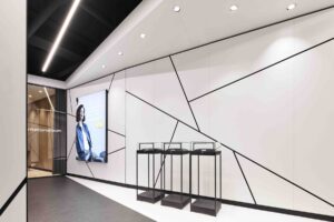 Besonderes Augenmerk lag auf der Entwicklung einer besonderen Raumstruktur, die auf den polygonalen Grundriss des Standorts reagiert. Vieleckige Formen wurden als wiederkehrendes Element daher auch an den Wänden aufgegriffen und ziehen sich über die unterschiedlichen Materialien hinweg durch die gesamte Filiale. Wegeführung und Beleuchtung wurden so konzipiert, dass sie Kunden intuitiv durch die Filiale leiten und zum Entdecken einladen sollen.
