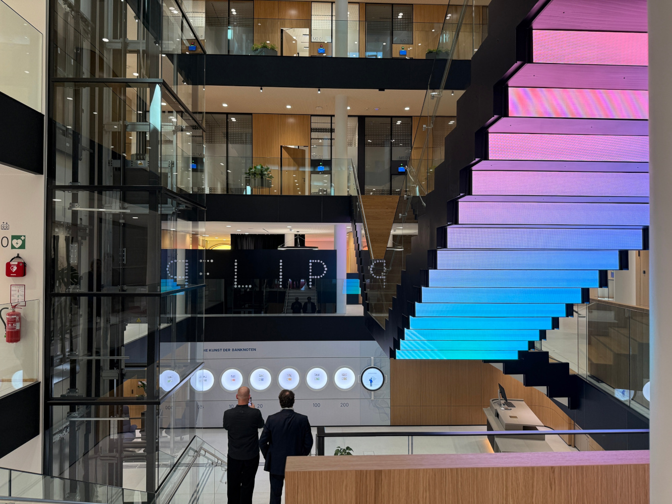 Ars Electronica Solutions gestaltet Installationen für Kärntner Sparkasse (Fotos: Ars Electronica/Isabel Schölmbauer)Im Foyer empfängt der Wertekompass die Besucher und ermöglicht es ihnen, die Atmosphäre des Raumes aktiv mitzugestalten. Über einen Drehregler lassen sich die Grundwerte der Kärntner Sparkasse – allen voran Verlässlichkeit, Mut und Regionalität – in leuchtenden Farben visualisieren. Mit der Auswahl startet auf einem Screen ein Video, das anhand konkreter Beispiele zeigt, wie die Sparkasse diesen Wert im Alltag umsetzt. Gleichzeitig reagieren die Stufen der zentralen Treppe: Ihre LED-Displays erstrahlen in der gewählten Farbe und machen den Begriff sichtbar. Wird das Terminal nicht bedient, entfaltet sich hier eine animierte Farbwelt – inspiriert von der Ästhetik moderner Banknoten. Als Vorgeschmack auf die Wiedereröffnung entwickelte Ars Electronica Solutions auch eine Fassadenprojektion, die den Wertekompass aufgreift.