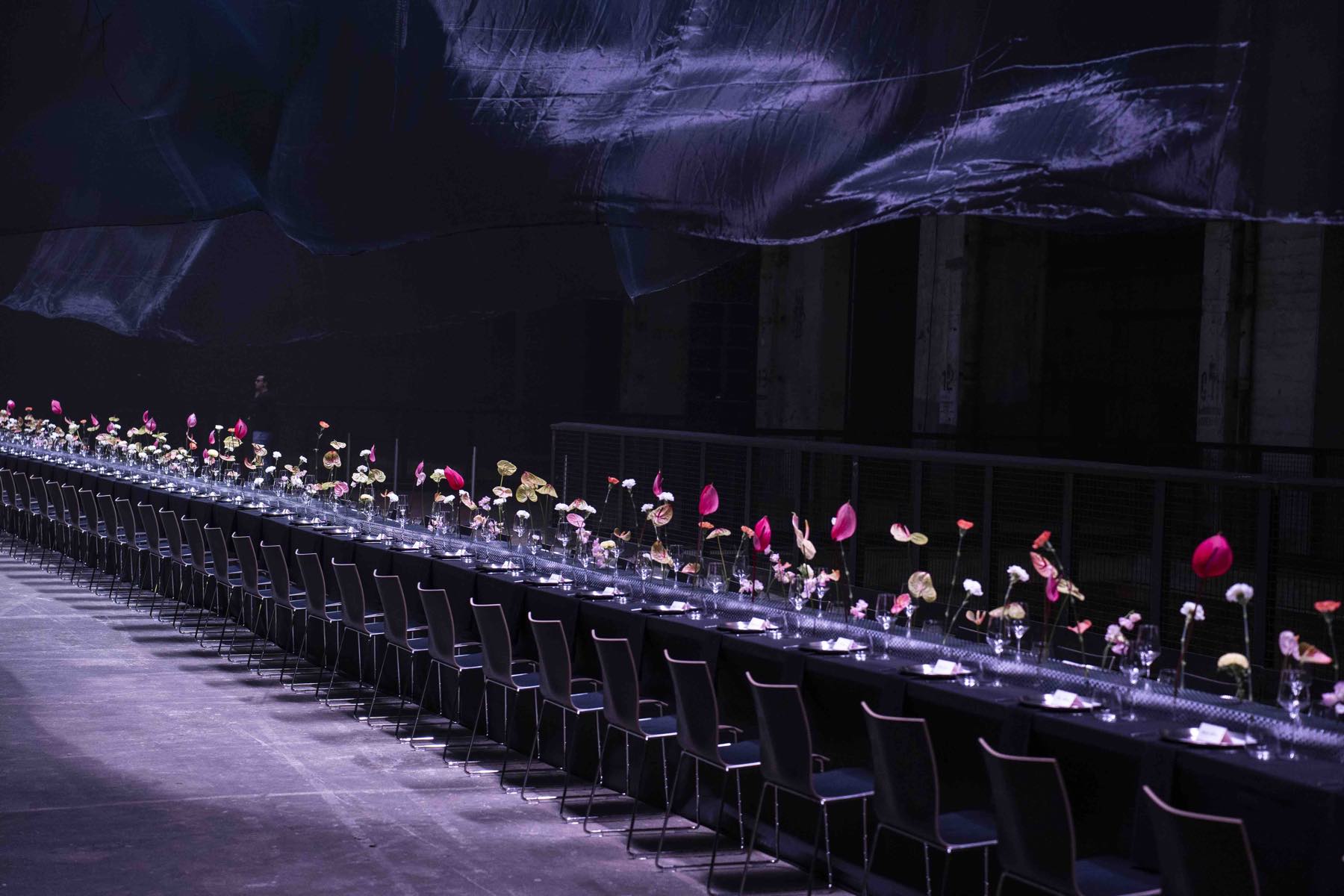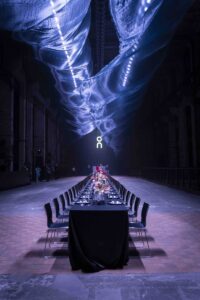 Ein besonderes Highlight war die Installation „Architecting Lightness“ des Künstlers Boris Acket. Sie kombinierte unsichtbare Luftströme mit kinetischen Stoffbahnen zu einem Raumkonzept, das Leichtigkeit physisch erfahrbar machte und gleichzeitig als Bühne für Abendveranstaltungen diente.
