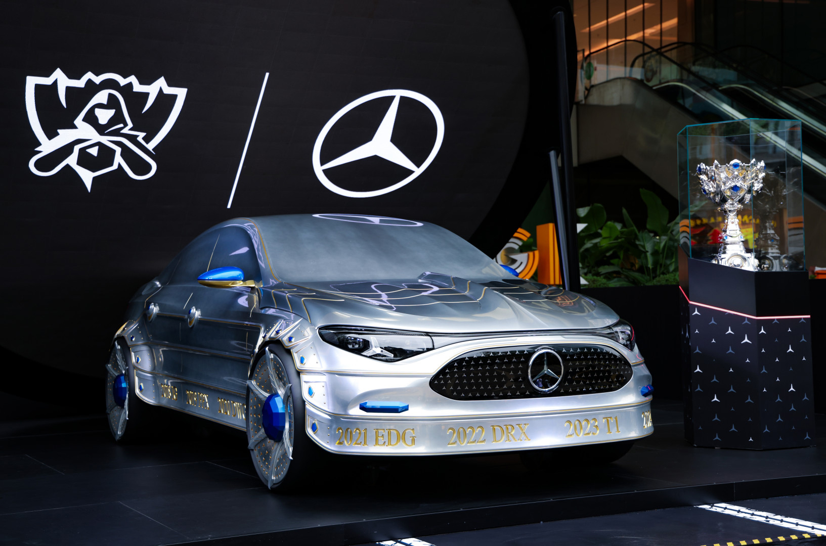 Mercedes-Benz beim League of Legends World Championship (Fotos: Mercedes-Benz)Das Art Piece auf Basis des CLA war inspiriert vom neuen Summoner’s Cup, welcher in diesem Jahr erstmals an das Siegerteam überreicht wurde. Neben dem Chrom-Finish fanden sich dort auch die blauen Saphire und goldenen Zierelemente des Summoner’s Cup auf dem Kunstwerk wieder.